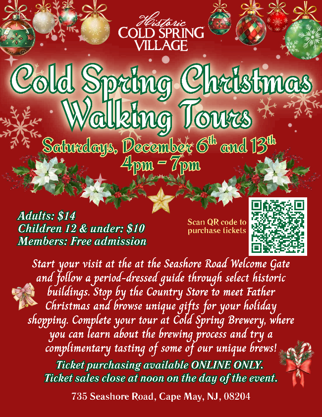 Stroll the tree lined paths with a guide and learn about Historic Cold Spring Village's buildings which will be decorated for the season. End your tour with shopping at the Country Store and a tasting at Cold Spring Brewery.